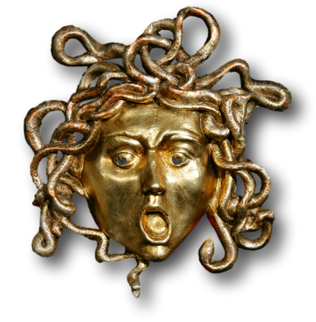 Maschera in cartapesta interamente realizzata a mano, ispirata al mito di Medusa. Il volto dorato, con bocca spalancata e sguardo intenso, è incorniciato da un intreccio dinamico di serpenti scolpiti che crea un effetto scultoreo potente e scenografico.